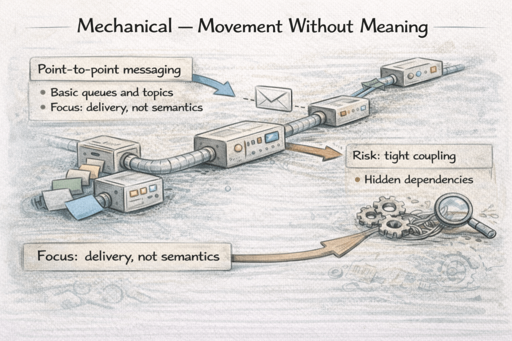 At this stage, systems focus on moving messages reliably from one place to another, without concern for what those messages represent. Coordination is achieved through direct connections and simple queues, but meaning remains implicit, creating tight coupling and hidden dependencies over time.