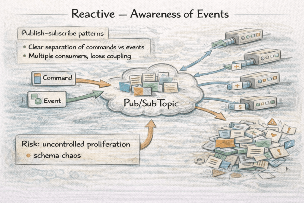 Here, systems begin to recognize the difference between actions and outcomes. Publish–subscribe patterns allow multiple consumers to react independently, improving flexibility, but without discipline this awareness can quickly lead to uncontrolled growth and semantic confusion.