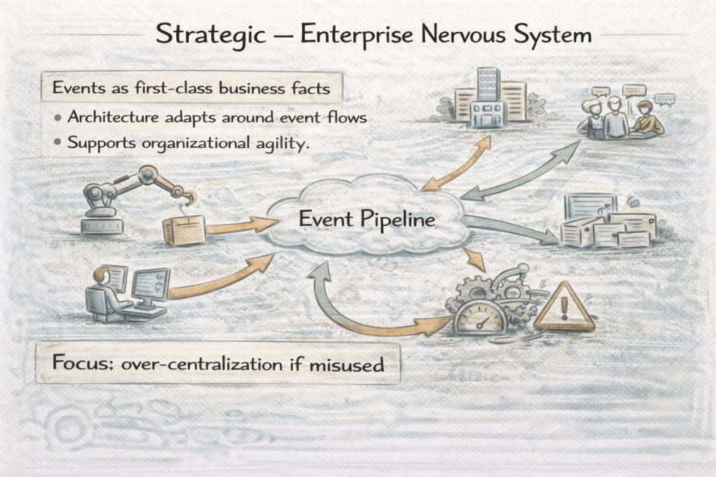 At the strategic level, events become first-class business facts that shape how the entire organization senses and responds to change. Architecture adapts around event flows to support agility at scale, while requiring careful balance to avoid excessive centralization of control.