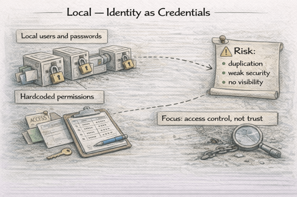 At this stage, identity is confined to individual systems, enforced through locally stored credentials and hardcoded access rules. Access works, but trust is fragmented—duplicated across applications, difficult to audit, and nearly impossible to evolve safely.