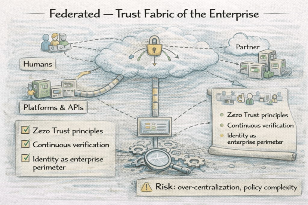 Identity becomes a unifying trust layer spanning humans, services, APIs, and external partners across organizational boundaries. Access is continuously evaluated, decoupled from location and perimeter, allowing the enterprise to scale without fragmenting trust.